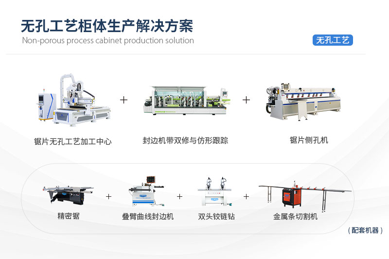 ?無孔工藝柜體生產(chǎn)解決方案無孔工藝柜體生產(chǎn)解決方案,主要由無孔工藝加工中心、鋸片側(cè)孔機(jī)、全自動(dòng)封邊機(jī)三種設(shè)備組成,可用于加工生產(chǎn)板式家具、櫥柜、衣柜、兒童家具等柜體的生產(chǎn)加工,滿足家具生產(chǎn)廠家對(duì)無孔家具(使用隱形連接件連接)、板式家具(使用二合一、三合一連接件)及普通板式家具的加工需求。