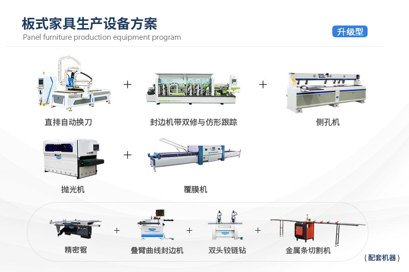 ?升級型-板式家具生產(chǎn)設(shè)備方案柜體/柜門(吸塑/平板)生產(chǎn)解決方案主要由直排換刀加工中心、封邊機、側(cè)孔機、拋光機、覆膜機、精密鋸、疊臂封邊機、雙主軸鉸鏈鉆、金屬條切割機組成,可滿足全屋定制廠家的生產(chǎn)加工,機器