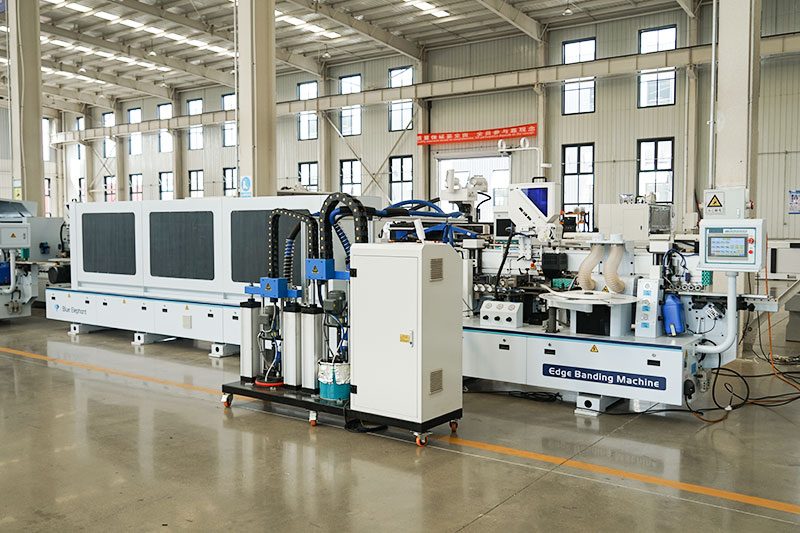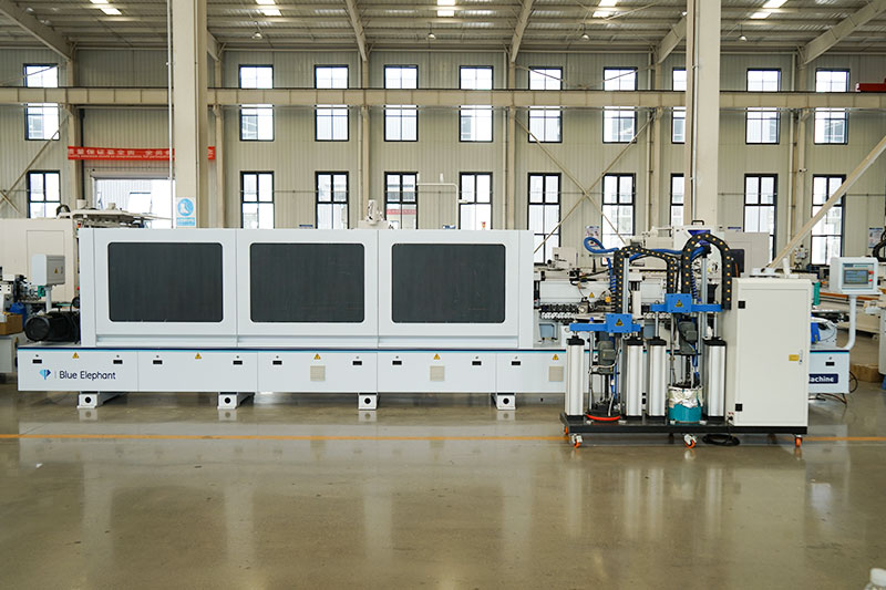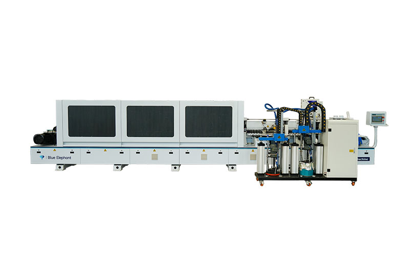 E-70JDSR全自動封邊機(jī)功能:前分離-預(yù)銑-涂膠貼邊1-涂膠貼邊2-齊頭-手動粗修-手動精修-跟蹤倒角-刮邊-平刮-后清洗-拋光1-拋光2